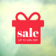 Gift Box SALE sign window cling featuring two rows of customisable text on a red gift box background. Default text is "Sale" and "up to 50% off". Put on your shop window to announce current sales.