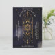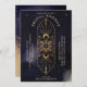 Beautiful holistic and spiritual bridal shower invitation design. The design features our own hand-drawn holistic sun and moon crest design in faux gold glitter. The design is created with intricate and decorative details. The background features a bold navy blue and gold design with twinking faux gold stars. Customise with your monogram, bride's name, event details, and time. The reverse side features a bold navy blue ink background with faux gold accents along with a gold moon design element.
