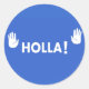 Famous Blue background with “Holla” printed in white & 2 hands raising the roof on the side.