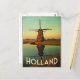 This classic scene of the Netherlands features a windmill on a pond with the reflection of the dusk sky.