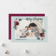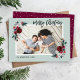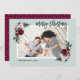 Affordable custom printed holiday photo cards with simple templates for customization. This festive design features an elegant watercolor floral border in red, green and burgundy colors on a mint background. The text reads "Merry Christmas" in a modern calligraphy script font. Personalize it with your photos, name, the year or other custom text. Reverse side has space for additional photos or text. Use the design tools to edit the text, add more photos and create a unique one of a kind holiday photo card design.