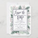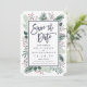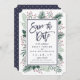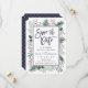 Modern and elegant holiday save the date card by Redwood & Vine is a perfect choice for announcing your Christmas season wedding! Festive design features "Save the Date" in hand lettered brush typography with your names, date, wedding location and website beneath, framed by a midnight blue border with chic botanicals peeking out at the edges. Hunter green pine boughs, sage green leaves and bright red berries add chic holiday charm to this festive and elegant winter save the date card.