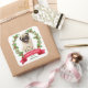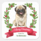On these Holiday correspondence stickers, a portrait of an adorable Pug dog is surrounded by a red berry holly wreath. At the bottom is a red banner with your custom Christmas greeting, and your signature is in green beneath it.