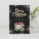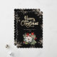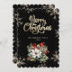 Elegant black watercolor Christmas card featuring sparkling snowflakes, poinsettia, conifer tree branches, holly and red berries.