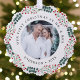 Send festive holiday greetings to your friends and family with a special Christmas keepsake celebrating your first Christmas as a married couple. The paper ornament card features your favourite wedding photo encircled by a wreath of holly berries, green eucalyptus, and white flowers. The design displays the phrase "Our First Christmas as Mr. & Mrs." in black text on the front and back. Personalise the front of the ornament by adding your photo, name, and the year. The back displays an additional wedding photo.