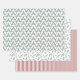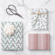 Beautiful holly themed Christmas gift wrapping paper sheets with three matching patterns, two with twigs of holly and one with an elegant red, green, and white striped pattern.