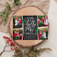 Rustic and whimsical holiday photo card features four photos in a collage layout, with "have a holly jolly Christmas" in white hand lettered typography on a chalkboard background, accented with red and green holly leaves and berries. Personalise with your names beneath, and add an additional photo to the back on a festive red background.