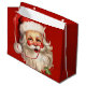 Gift bag with a joyful illustration of a vintage style Santa Claus with red rosy cheeks. wearing his classic red Santa hat and his big white bear. A sprig of holly adds to the festive holiday spirit of this design.