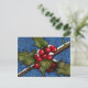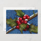 My illustration of a clump of holly leaves with bright red berries; snow falls against a deep blue background.