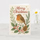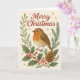 Send traditional holiday cheer with this charming Christmas card featuring a classic red-breasted robin surrounded by holly leaves, pine branches, berries, and a rustic pinecone.