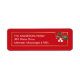 Red and gold return address label with a sprig of holly in the corner.