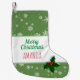 Festive and modern personalizable Christmas holiday stocking. Personalise the stocking with your text and name. The text Merry Christmas is in a trendy green script. Christmas holly tree berry makes this design festive. Beautiful white snowflakes are on a festive green background. Wish happy holidays and give a present to your friends and family in this holiday stockings.