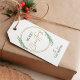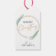 Complete your holiday packaging and presents with a personalised holly wreath Merry Christmas gift tags. This Greenery Christmas tag includes a gold wreath with green leaves and elegant script font, with space for your name or family surname. The perfect finishing touch to your Christmas gifts.