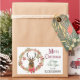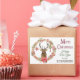 On the left side of this Holiday label, a pretty watercolor holly and red berry wreath is decorated with a red bow. Ornaments hand from the wreath, and a reindeer is at the centre. Your custom text is at the right. Many uses during the Christmas and New Year Season!