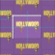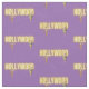 Fun fabric pattern features Hollywood in neon text with two vintage beauties photo cutouts on purple background