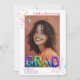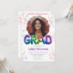 Celebrate the graduate in style with this vibrant and modern holographic balloon lettering graduation invitation. Featuring two customisable photo spots, this fun and festive design is decorated with shimmering confetti and eye-catching balloon text that spells "GRAD" in rainbow metallic hues. The rounded edges add a sleek touch, while the mix of playful and bold typography makes it a standout choice for any high school or college graduation celebration. Perfect for announcing the big milestone with a fun and energetic vibe!