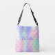 A rainbow, unicorn coloured holographic background in pink, purple and mint green. Personalise and add your name, monogram initials, purple letters. The name is written with a modern handlettered style script. Your monogram as background pattern.