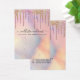 This girly and glamourous multiple earring display card (edit the "earring hole" line to change the number of holes) is the perfect way to stylise your packaging and add your own personal flair and personality. It depicts chic, pretty, unique, and luxurious faux printed sparkly rainbow colour glitter drips on top of a holographic iridescent foil background. The typography is an elegant cursive script with a modern serif font to match. The colour scheme includes pink, peach, blue, purple, gold, and coral. On the back, it includes contact information that can be changed completely or personalised to your details. It's a professional, elegant, and stylish way to display your product with pride. (earring holes are printed markers only, puncturing must be completed by the customer)