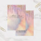 This girly and glamourous earring display card is the perfect way to stylise your packaging and add your own personal flair and personality. It depicts chic, pretty, unique, and luxurious faux printed sparkly rainbow colour glitter drips on top of a holographic iridescent foil background. The typography is an elegant cursive script with a modern serif font to match. The colour scheme includes pink, peach, blue, purple, gold, and coral. On the back, it includes contact information that can be changed completely or personalised to your details. It's a professional, elegant, and stylish way to display your product with pride. (earring holes are printed markers only, puncturing must be completed by the customer)