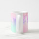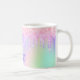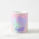 A trendy holographic background with unicorn and rainbow pastel colours in pink, purple, mint green. Decorated with drips in pink and purple. Personalise and add a name, written with a modern hand lettered style script. Purple coloured letters.