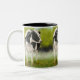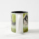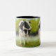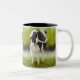 Original fine art design of a Holstein milk cow in her pasture by illustrator Carolyn McFann on a cool two tone coffee mug for farm animal fans.