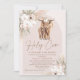 Bohemian inspired baby shower invitation featuring two floral arrangements with pampas grass, a modern calligraphy image heading and a blush colored arch and a highland cow and calf. This modern bohemian floral holy cow baby shower invitation is ideal for anyone having a girl's bohemian inspired baby shower.