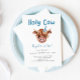 Cute farm theme boy's birthday party invitation card featuring watercolor illustration of a highland cow. The text says "holy cow!"