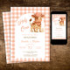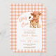 Featuring an adorable baby cow in a peach gingham bandanna and cowboy hat, this design brings together farmhouse sweetness and playful charm. Set against a soft, peach plaid background, the warm tones and country flair make it ideal for gender-neutral celebrations or any mum- and pop-to-be who love down-home style.