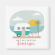Vintage inspired turquoise camper parked on the beach with flamingos and palm tree in front of ocean and sunrise. Text says, "Home is where you put your flamingos"