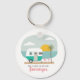 Vintage inspired turquoise camper parked on the beach with flamingos and palm tree in front of ocean and sunrise. Text says, "Home is where you put your flamingos"