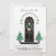 A classic front porch decorated for the holidays, featuring Christmas trees with stars flanking the elegant black door, a pine wreath with pink gingham bow, and lanterns topped with roses and holly. In the style of Magnolia | modern farmhouse | classic elegant. 3 COLORS OF PLAID FOR THE BACK ARE IN THE DESIGN (green as shown, black, or pink - just edit and hide the ones you don't want).
