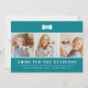 Our pet dog themed “Home for the Holidays” Christmas card features a collage of three square photos of your new puppy to share with friends and family. Personalise the text with a custom greeting, your last name or family, your pup's name, and the year. Modern teal blue design includes cute paw print, dog bone, and a coordinating gingham / buffalo plaid pattern on the back.
