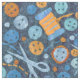 Fabric features cute home hobbies pattern, sewing supplies - scissors, buttons, spools of thread, needles - scattered on dark blue background. This design, elaborated from handmade paper collage, makes a great gifts for crafters and sewers.