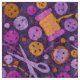 Fabric featuring lovely pattern, sewing supplies - scissors, buttons, spools of thread, needles. This design, elaborated from handmade paper collage, makes a great gifts for crafters and sewers. Violet, pink, magenta and yellow orange colours.