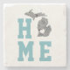 Home Is Michigan The Great Lakes State Stone Coaster. Teal blue lettering with the shape of Michigan as the "O". Michigan is filled with a floral print in grey and blue with a white heart. Show your love for your home state! Design by The Michigander.