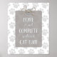 Scrapbook style typography poster with the phrase, "HOME is not COMPLETE without CAT HAIR." Faux ribbon and button on a background that has grey animal paw prints. Designed by Rycky Creations; elements from Pixelscrapper.