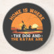 Colourful kayak design for anyone who loves kayaking with their dog! This kayak design features a person and his dog kayaking on a river with text that reads Home is Where The Dog and The Kayak Are!