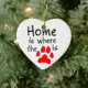 A wordplay with the quote "Home is where the heart is", this heart shaped ceramic ornament has the words "Home is where the [paw print picture] is", with the paw print picture in red, representing the "heart". The perfect gift for pet lovers.