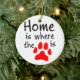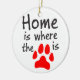 A wordplay with the quote "Home is where the heart is", this round ornament has the words "Home is where the [paw print picture] is", with the paw print picture in red, representing the "heart". The perfect gift for pet lovers.