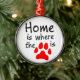 A wordplay with the quote "Home is where the heart is", this round ornament has the words "Home is where the [paw print picture] is", with the paw print picture in red, representing the "heart". The perfect gift for pet lovers.
