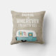 Customised Family Name (or Couple's Name as shown) Home is Wherever I'm With You Camper Camping Travel Trailer RV throw pillow. Whimsical aqua blue camper with heart accents and tan rustic background accented with a rustic style "Home Is Wherever I'm With You" quote. Easily customise it yourself by adding your family name, first names or camper name to the side of the camper trailer as shown.