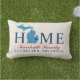 Stylish welcome pillow features "Home" text with Michigan state map and custom text that can be personalised with your family name and the city, state where you live. The navy blue heart city marker can be moved to the appropriate location via Customised. Horizontal stripes dress up the reverse side. Navy, blue, red, and soft white colours.