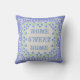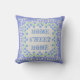 A very pretty Square Throw Pillow or Cushion, with 'Home, Sweet Home' in vintage lettering and a border pattern of Blue Periwinkle flowers and Green foliage, on a Faux Linen background. Part of the Posh and Painterly 'Periwinkle Patch' collection, this pattern can easily be customised to fit any Square Pillow or Cushion.