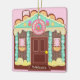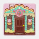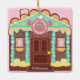 A cookie/candy house with chocolate and frosting on sugar-pink background.