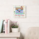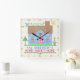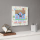 Decorate your wall with a personalised, country house square clock. This clock design is made to resemble a vintage cross stitch embroidery sampler. It shows a blue house made of "x"s with a bird, the sun and plenty of hearts and flowers in the same style. The background is beige with a slight check pattern to look like embroidery material. The clock numbers are also done in a needlepoint style.