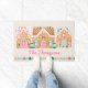 Welcome everyone to your home this holiday season with this adorable gingerbread house door mat. This design features a festive Gingerbread house decorated with pink, green and white. You can personalise this door mat with a name. Coordinates with the Gingerbread Party collection.