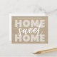 This postcard features a textured look background and bold lettering on the front saying "Home Sweet Home" in shades of white. Use the template form to add your custom text to the front and back of the card. Use the Customise It button to add additional text.
