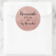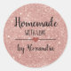 Modern "homemade with love" sticker with a black font on a rose gold glitter background embellished by a cute red heart. Customise text.