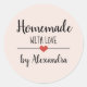 Modern "homemade with love" sticker with a black font on a blush pink background embellished by a cute red heart. Customise text.