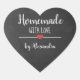Modern "homemade with love" sticker with a white script font on a black chalkboard background embellished by a cute red heart. Customise text.